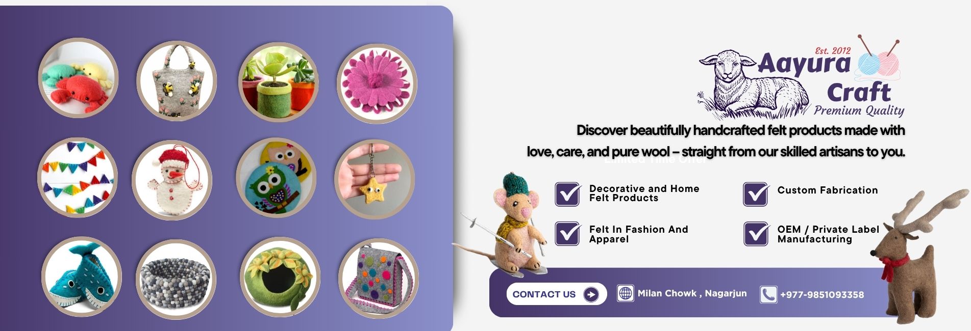 Aayura Craft is a proudly established felt product company based in Nepal, dedicated to preserving the art of handmade craftsmanship while promoting eco-friendly and sustainable practices. With over 8 years of experience, we specialize in the manufacturing and export of 100% pure wool handicrafts, carefully created by our talented team of skilled artisans.